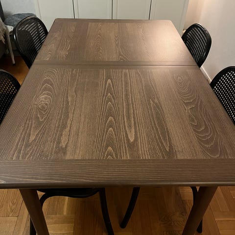 Vi säljer nu vårt matbord från Mio. Inköpt 2024. Vitpigmenterad ek med iläggsskiva som sitter fast under bordet. Utan ilägg är bordet 150cm långt och med ilägg blir det 200cm.