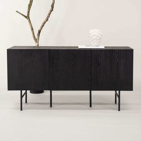Säljer ett vitt högblankt skåp med två skåpdelar, vardera med två hyllplan, samt fyra rymliga lådor i mitten.