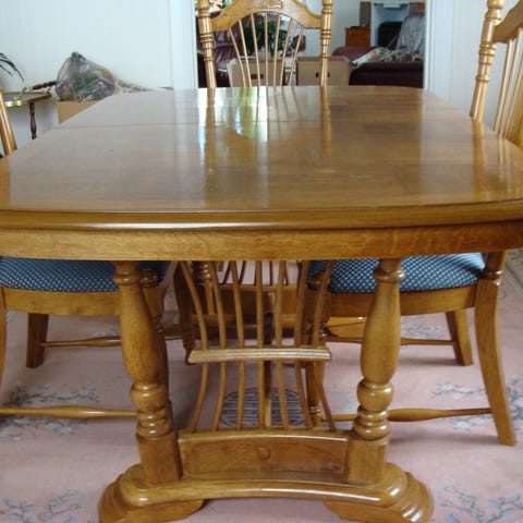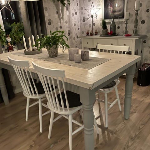 En custom glaskiva i 6mm frostat glas som är härdad följer med. Det gör att man kan ställa varma ugnsformer samt kastruller rakt på bordet utan underlägg. Har legat där hela tiden så bordet har inga repor eller skador.