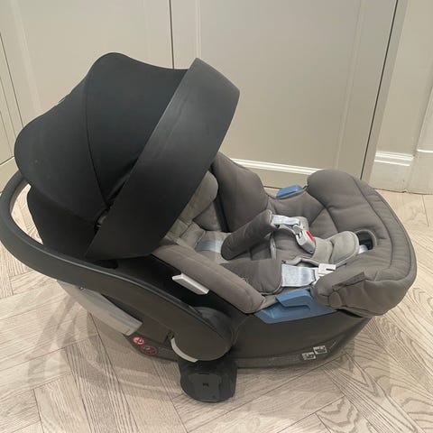 Nytvättat tyg, helt och rent. Isofix basen kan även bältas om man saknar isofix i bilen.