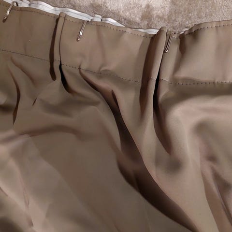 Ett par grå mörkläggningsgardiner. De är uppsydda till 260cm för att passa höjden i vårt sovrum.