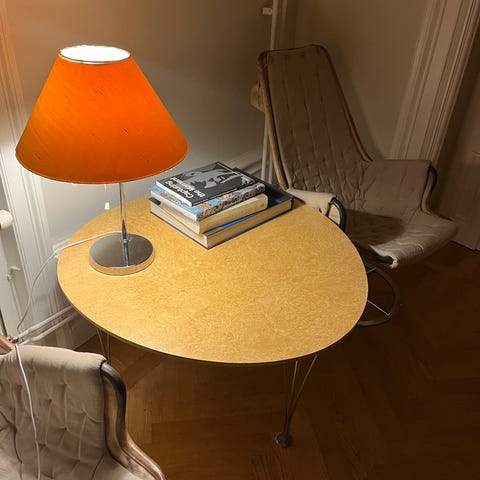Superellips soffbord, omslipat och behandlat med hårdvaxolja. Småmärken finns.