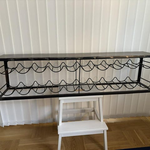 Fint vinställ i svart metall med plats för 30 stycken flaskor. Det finns även plats för hängande vinglas.