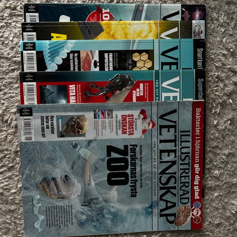 Illustrerad Vetenskap vetenskapstidningar med olika omslag och teman, inklusive artiklar om utdöda djur, stadsutveckling och läkemedelsforskning. Tidningarna är på svenska och innehåller vetenskapliga reportage och nyheter.