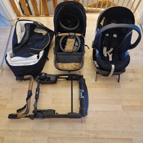 🎨 Färg: Indigo Blue – en elegant mörkblå nyans med bruna leatherette-detaljer på handtag och bygel. Babyskyddet har ett stilrent silverfärgat chassi och sittdelen matchar med svarta säkerhetsbälten. En riktigt snygg vagn som sticker ut!