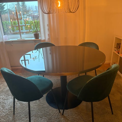 Matgrupp från Ellos svart matbord med gulddetaljer tillsammans med 6 matstolar i ljusgrå sammet med svarta ben och gulddetaljer. Stolorna är i väldigt fint skick, märken finns på bordet.