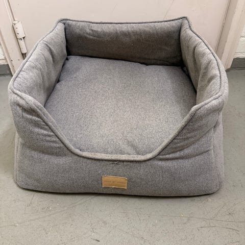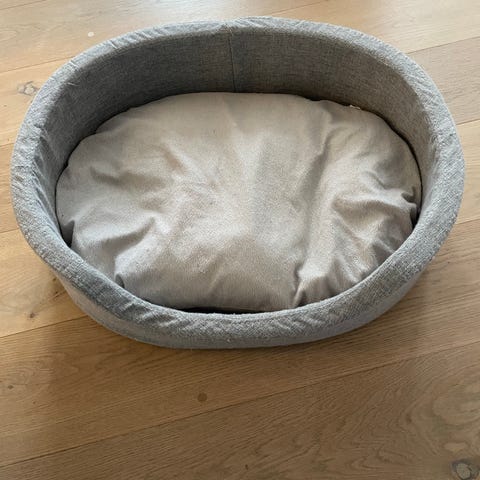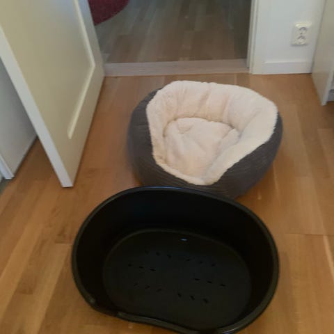 En rund hundbädd i beige med vadderad kant och mjuk insida. Medföljer två rostfria matskålar i svart med mönster samt ett rött flexikoppel och ett blått vanligt koppel.