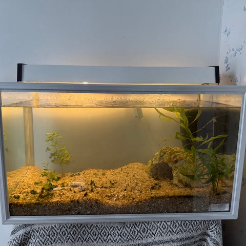 Inkluderar belysning med LED-lampa på flera färger, grus som bottenmaterial samt olika tillbehör för akvarieskötsel.