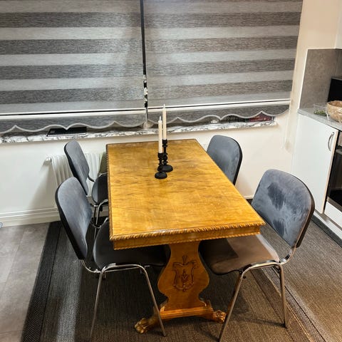 Det finns normalt slitage och repor på skivan (se bild), vilket ger bordet en rustik känsla – alternativt ett bra objekt för den som vill slipa och ytbehandla själv. Ett av benen är lite snett men inget som påverkar själva bordet (Se bild)