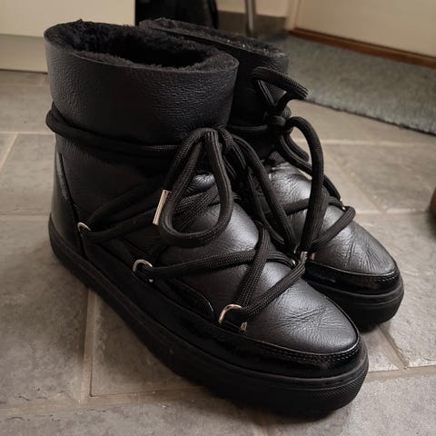 Inuikii vinterskor i storlek 39 i brun/taupe färg. Skorna är tillverkade i lamskinn/mockamaterial som lämpar sig för vinterbruk och har en robust sula för bättre grepp. Designen inkluderar snörning och en vadderad insida för komfort och värme.
