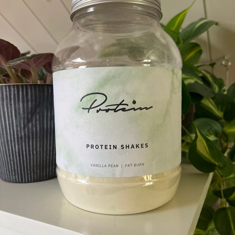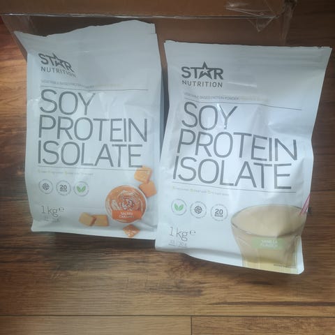 3 st 500 g Gaam protein pudding casein, en öppnad som väger 422 gram och en öppnad Body Science kanelbulle som väger 206 gram.