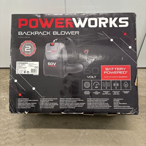 Powerworks 60V Blower med batteridrift. Produkten är avsedd för uppblåsning och rengöring av utomhusytor. Drivs av ett 60 volts batteri och är en del av Powerworks batterisystem. Helt ny i förpackning.