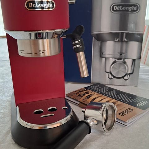 De'Longhi Magnifica S espressomaskin i svart färg. Utrustad med olika inställningar för bryggning av espresso och kaffe. Har en mjölkskummare för att tillaga cappuccino och andra kaffedrycker. Maskinen är avsedd för hemmabruk.