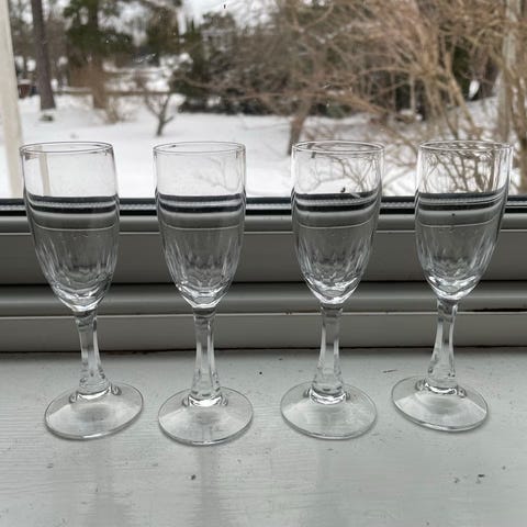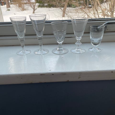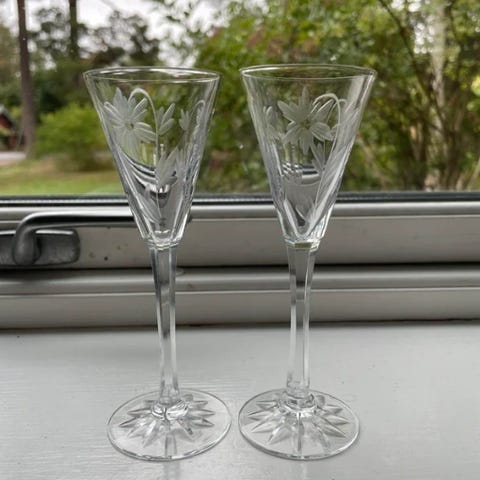 Två glas i klarglas med graverat mönster. Glasen har en rund kupa med dekorativa stjärnliknande gravyrer och en fot med en klotrund detalj. Passar för servering av drycker.
