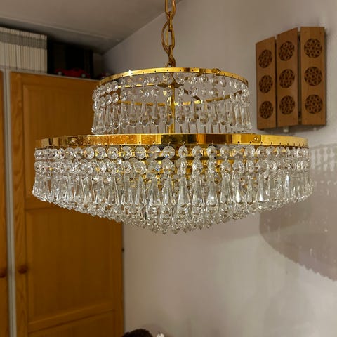 Fint kristallkrona från 1980 talet, komplett prismor, 4 lampor och 5 levande ljus källor. Bra skick sparsamt använt.