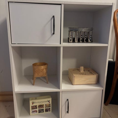 Två söta vägghyllor som varit i vår sons sovrum. 22,5 cm på högsta stället & 19 cm breda, 10 cm djupa. Ena har ett litet märke på ovan sidan. Har inte tänkt på det när de har hängt på väggen. Går att måla om dem lätt till samma färg som väggen om man vill.