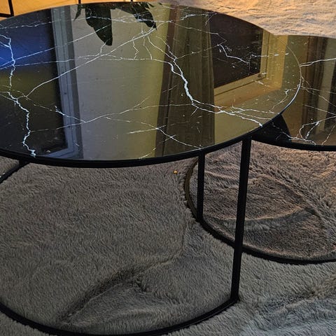 Säljer en stilren uppsättning med 4 satsbord i svart med exklusiv marmoreffekt. Perfekta som soffbord, sidobord eller extra avlastningsyta när du får gäster.