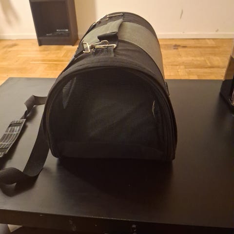 Transportväska i textil säljes. Kan bäras i handtag eller axelrem. Sätts fast i bilens bilbälte och hunden/katten sätts fast i rem med hyska. Går att fälla ihop så den blir platt. Storlek ca 45 cm lång, 30 cm bred samt 30 cm djup. Min lilla hund satt på en kudde i den. Många fickor och fack för förvaring. Går att stänga upptill så att hunden är helt instängd (nät).