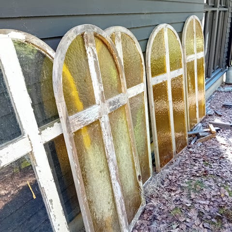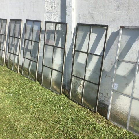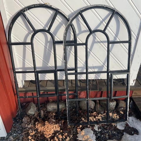 Två fönsterbågar av metall med glasrutor.