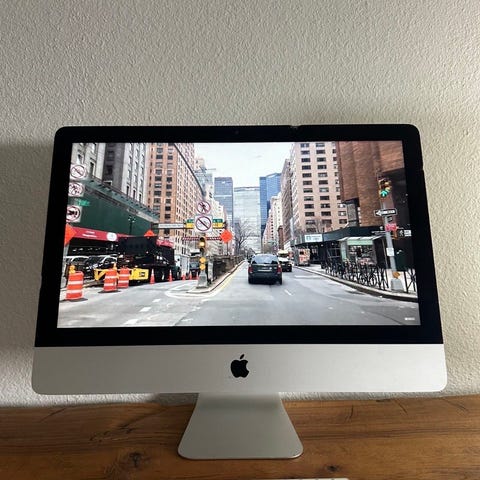 Apple iMac G3 dator med tangentbord och mus. Färgen är grå.