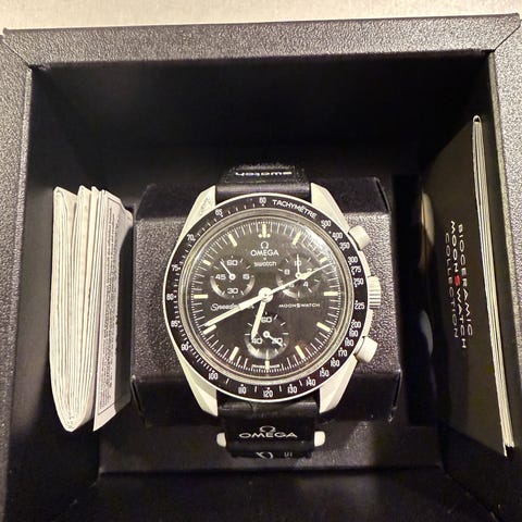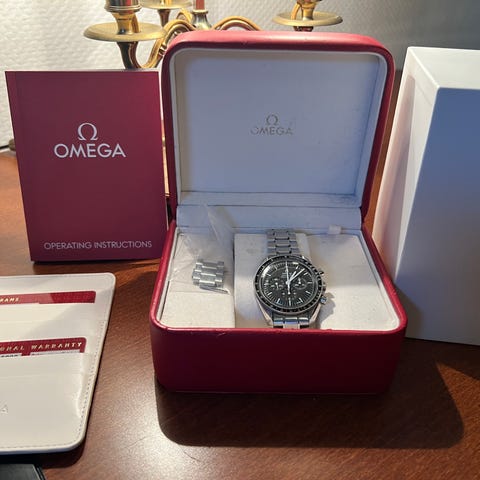Omega Speedmaster herrklocka med svart urtavla och grått armband. Klockan är designad för män och har funktioner anpassade för tidtagning och precision.