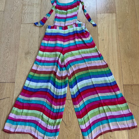 En unik jumpsuit från det populära australiensiska märket Jaase. Den har ett levande, flerfärgat mönster i nyanser av lila, orange, blått och gult. Designen är typisk för Jaase med en feminin "boho-chic" känsla, vida ben, utskurna detaljer vid midjan och knytning i ryggen.