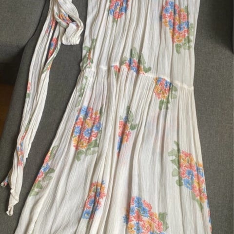 Detaljer: Knytfuktion bak, resår i midjan och dekorativa mönsterbårder.
