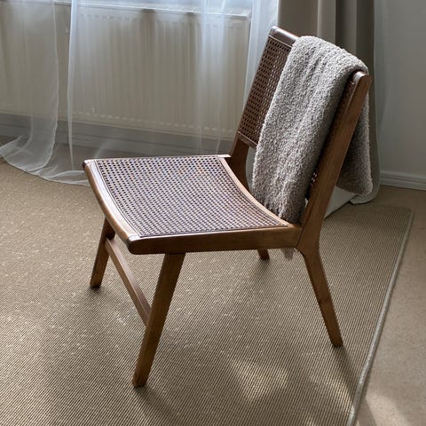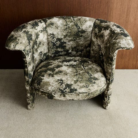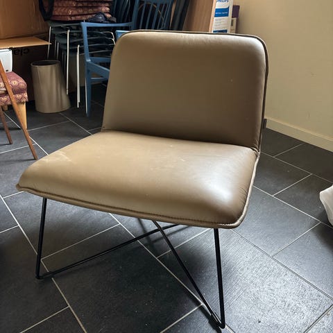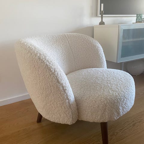 Superfin loungefåtölj, i princip oanvänd, nougatfärgad i sammetsliknande material.