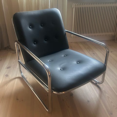 Stilren och bekväm loungestol. Klädsel med struktur i tyget. Stolen har svarta ben i metall. sitthöjd: 45 cm.