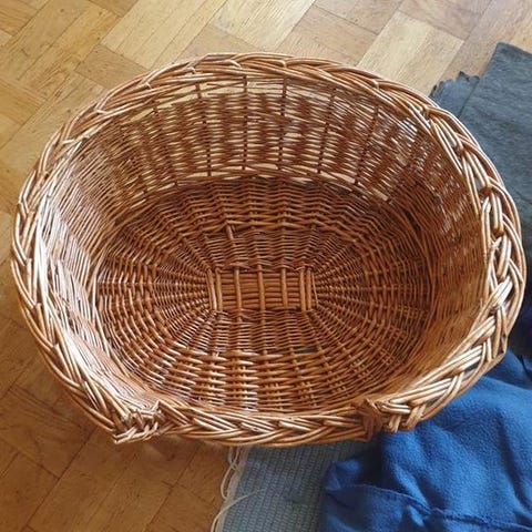 Hundkorg/bädd i grått tyg med svarta handtag och svart botten. Fyrkantig form och mjuk stoppning. Handtagen är något slitna & nån liten rosa färgfläck (som kanske går att ta bort, jag har inte försökt) finns, annars i fint skick.