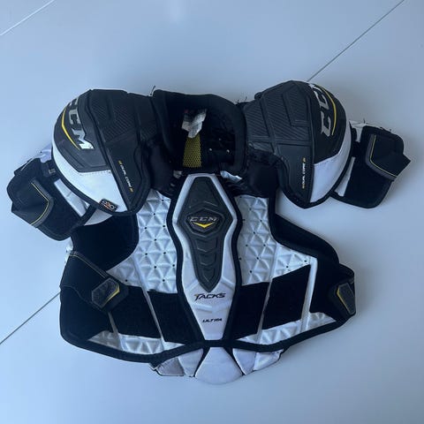 Axelskydd, armbågsskydd, halsskydd samt svarta hockeybyxor. Passar spelare ca 10-12 år.
