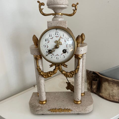 Antikt franskt kaminur i marmor & mässing + kandelabrar (set)