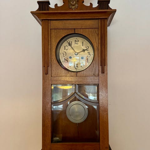 Mekaniskt urverk med två uppdrag (tid och slag). Pendeln i form av en sol med ansikte finns kvar men är lös och behöver fästas tillbaka. Funktion ej testad, säljs som dekorativt antikt objekt.
