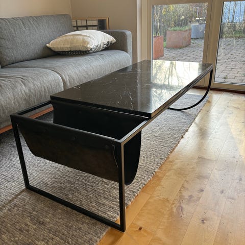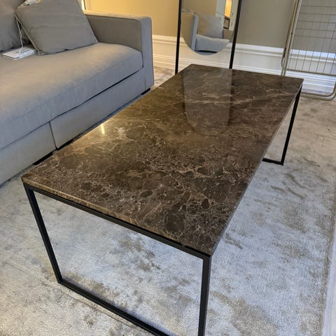 Säljer vårt soffbord Vitro från Bolia. Bordet har en exklusiv bordsskiva i vit marmor och ett svart stålunderrede.