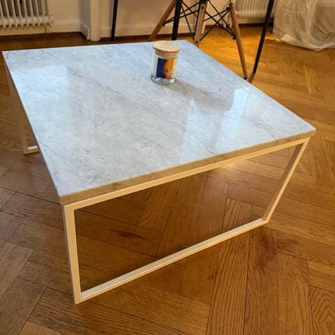Bordet är använt och har några märken i marmorn. de syns endast vid spegling i fönster och var svårt att fånga på bild (se bilder) vilket återspeglas i priset. Det är inte omöjligt att märkena går att polera bort, men det är inget vi själva har testat.