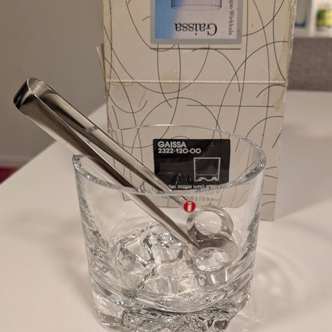 Iittala hopla kanna i glas med texturerad yta och handtag.