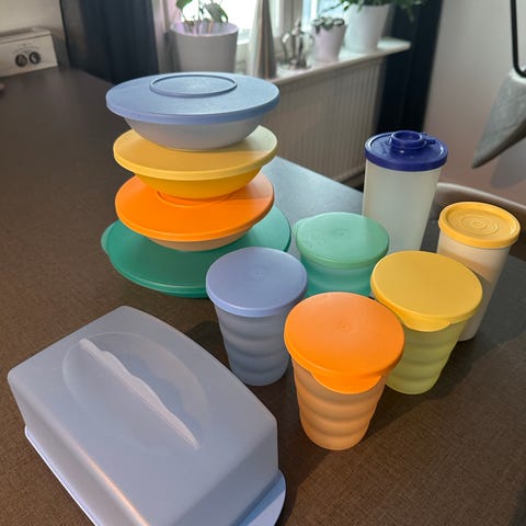 Salt- och pepparkar tillverkade i plast. Setet består av två delar med olika färger, beige och blå. Används för kryddförvaring och servering vid matbordet.