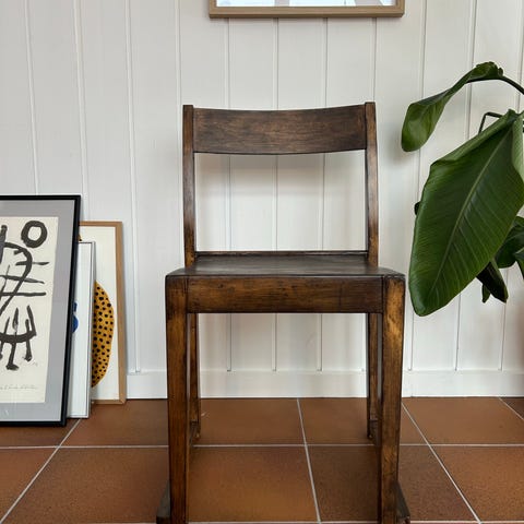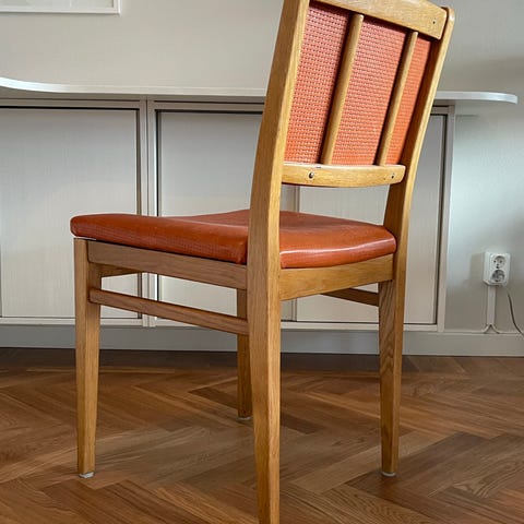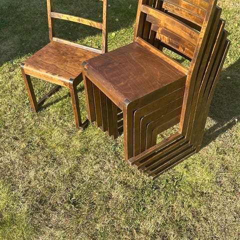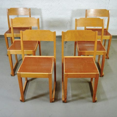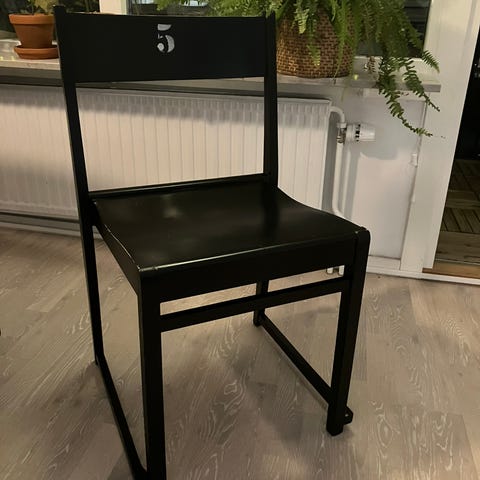 Säljer 5 mörkbetsade trästolar, liknande orkesterstolen. Köpta på auktion. Fint använt skick.