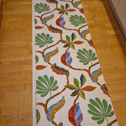 Helt nytt tyg i gröna nyanser. Nästan 4 meter. Träd och näckrosor. Kanske lite retro känsla.