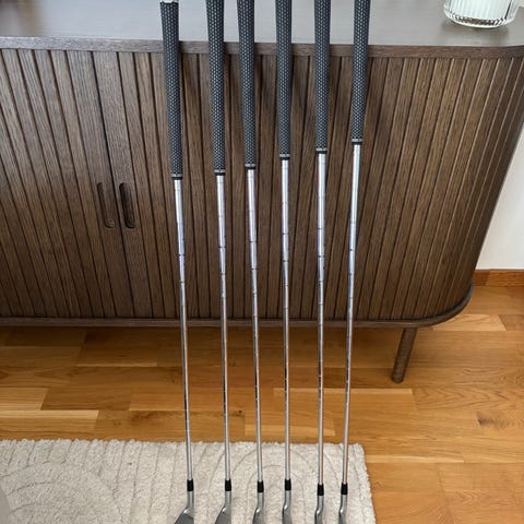 Säljer nu mina Ping GMax järnklubbor, ett förlåtande och bra set för nybörjare såväl som medelgolfare. Bred o härlig sula för att underlätta ren bollträff. Klubborna har fina Lamkin midsize grepp som ger ett bra grepp i handen. 5:an har ett Ping originalgrepp (knappt använt klubban). Skaften är Ping AMT 2.0 stålskaft i regular styvhet.