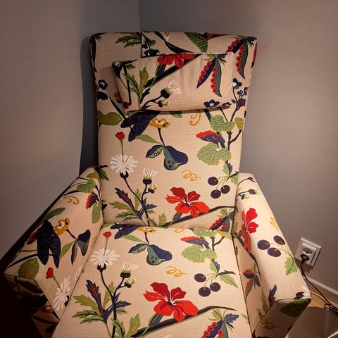 Vi har suttit på fåtöljen med jeans, därav svag missfärgning som syns på bild. Däremot märks inte det i verkligheten och vi har tvättat fåtöljen med Kärcher textiltvätt nyligen. I övrigt är tyget och stolen som ny!
