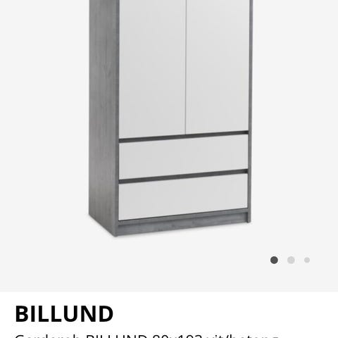 Jysk garderob med två dörrar och två lådor i nederkant. Färgen är vit/betong och den är tillverkad i trämaterial.