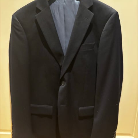 Kavajen är blå och har ett rutmönster.