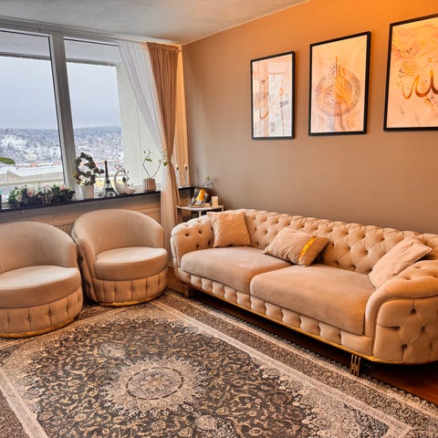 Audo Copenhagen soffgrupp med beige tyg och trästomme