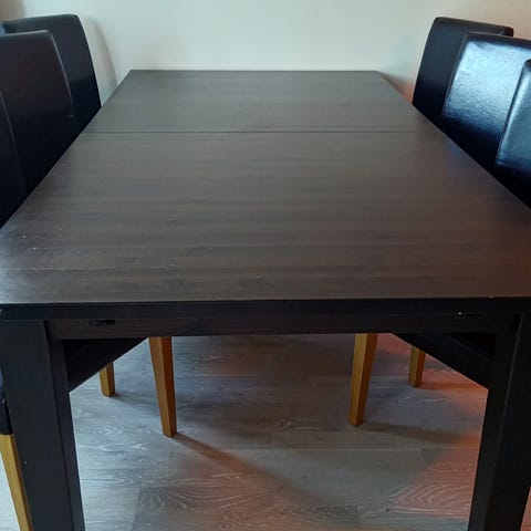 Matbord stabilt och helt i trä, väldigt rymligt, har plats för minst 6 pers, bordet är tung och stadig och tidlös modell som passar alla hem.