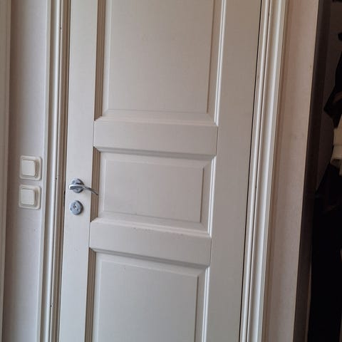 100 kr styck. Rejäla innerdörrar i massiv furu. Handtag ingår, gångjärn på dörr ingår. Mått 7x20, dörrbladet är alltså 63 cm x 194 cm. Tre högerhängda, två vänsterhängda. Dörren med glas är högerhängd. Alla är hela men fjäder i en av dörrarnas låshus behöver bytas, handtaget hänger. Enstaka skönhetsmärken.