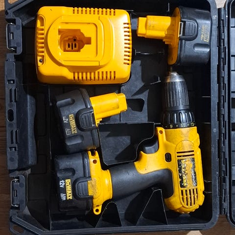 Borrmaskin med avtagbart huvud som gör att den även kan användas med bits. Maskin, två batterier, laddare samt låda medföljer. Lådan är är delvis defekt så den håller sig en helt slängd själv. Maskinen har ej används på länge, men efter att ha laddat batterierna så verkar den funka ok. Endast testat kort. Allt för endast 200 kr