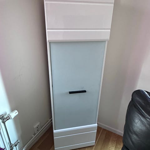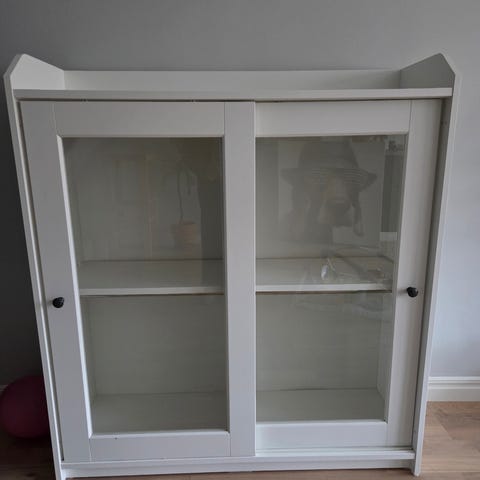 Fint vitrinskåp från IKEA, inköpt för cirka 8 år sedan. En mindre reva på ca 3 cm vid ena knoppen som man enkelt kan måla över om man vill. Inget vi har stört oss på. I övrigt är skåpet i toppskick.