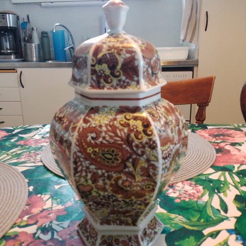 Vacker pampig lampa från Aluminia (Grete Helland) Copenhagen Denmark. Väldigt ovanlig och vackert bemålad. Mäter nära 70 cm på höjden.
