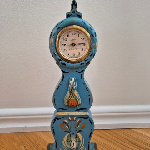 Vackert grått golvur i trä med målad dekor. Vacker unik design. Passar som tidsvisare och inredningsdetalj i hemmet.